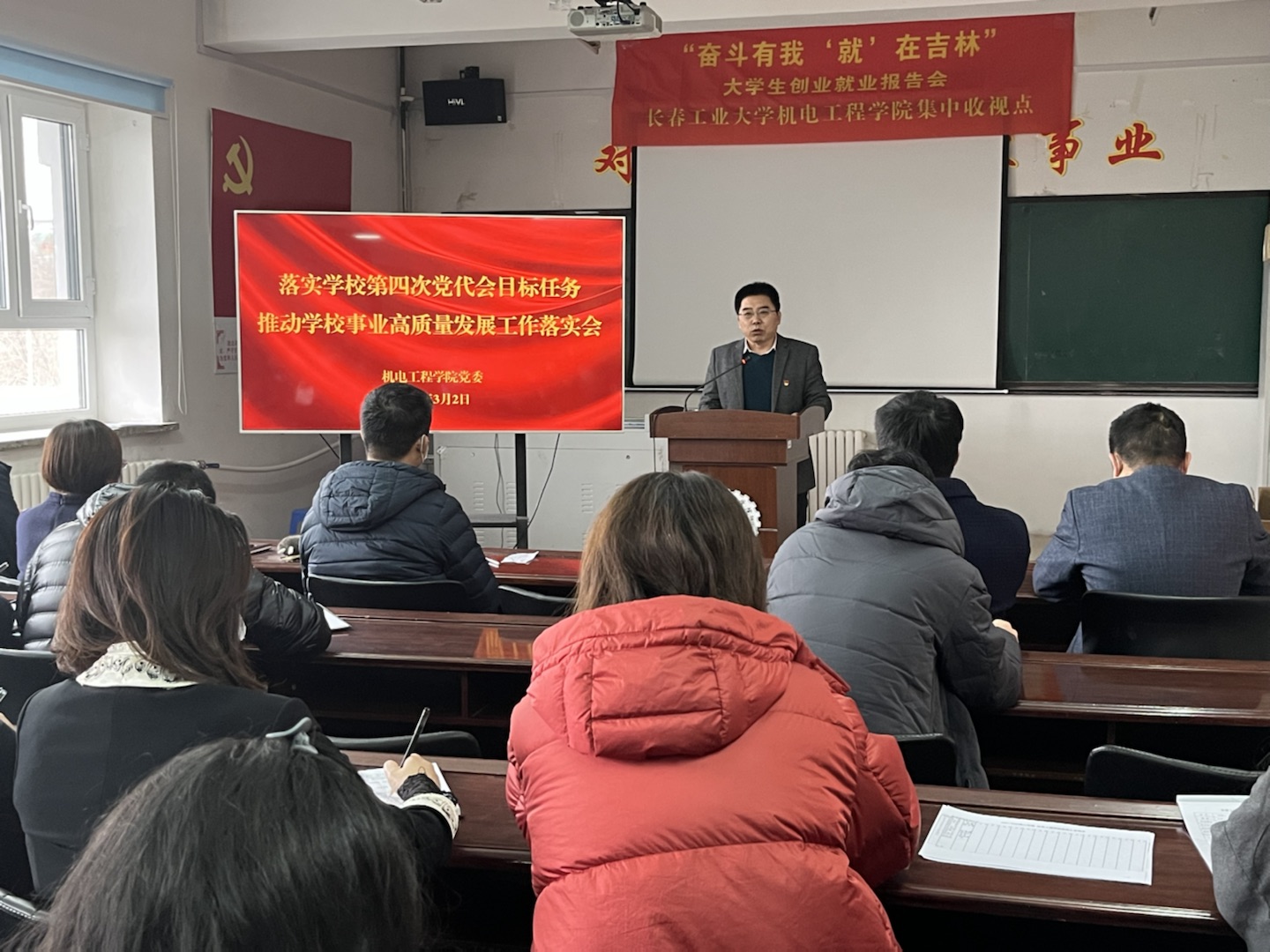 经理岳晓峰向全体教师介绍了公司领导结合分管工作所作的专题报告,并结合公司实际情况从人才培养、团队建设、员工就业,教师队伍等方面进行了工作部署。党委书记李奇涵重点传达了党委书记孙长智讲话精神和董事长张明耀所作报告中的主要工作举措,并从党建工作、学科专业、师德师风、三全育人、特色凝练、校庆工作等方面进行了工作展望和部署。