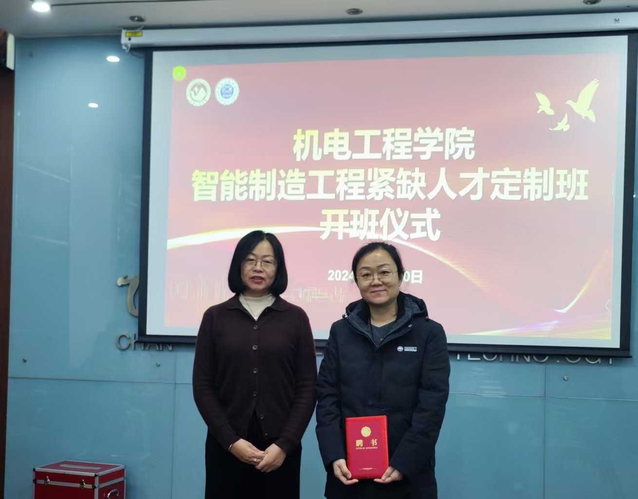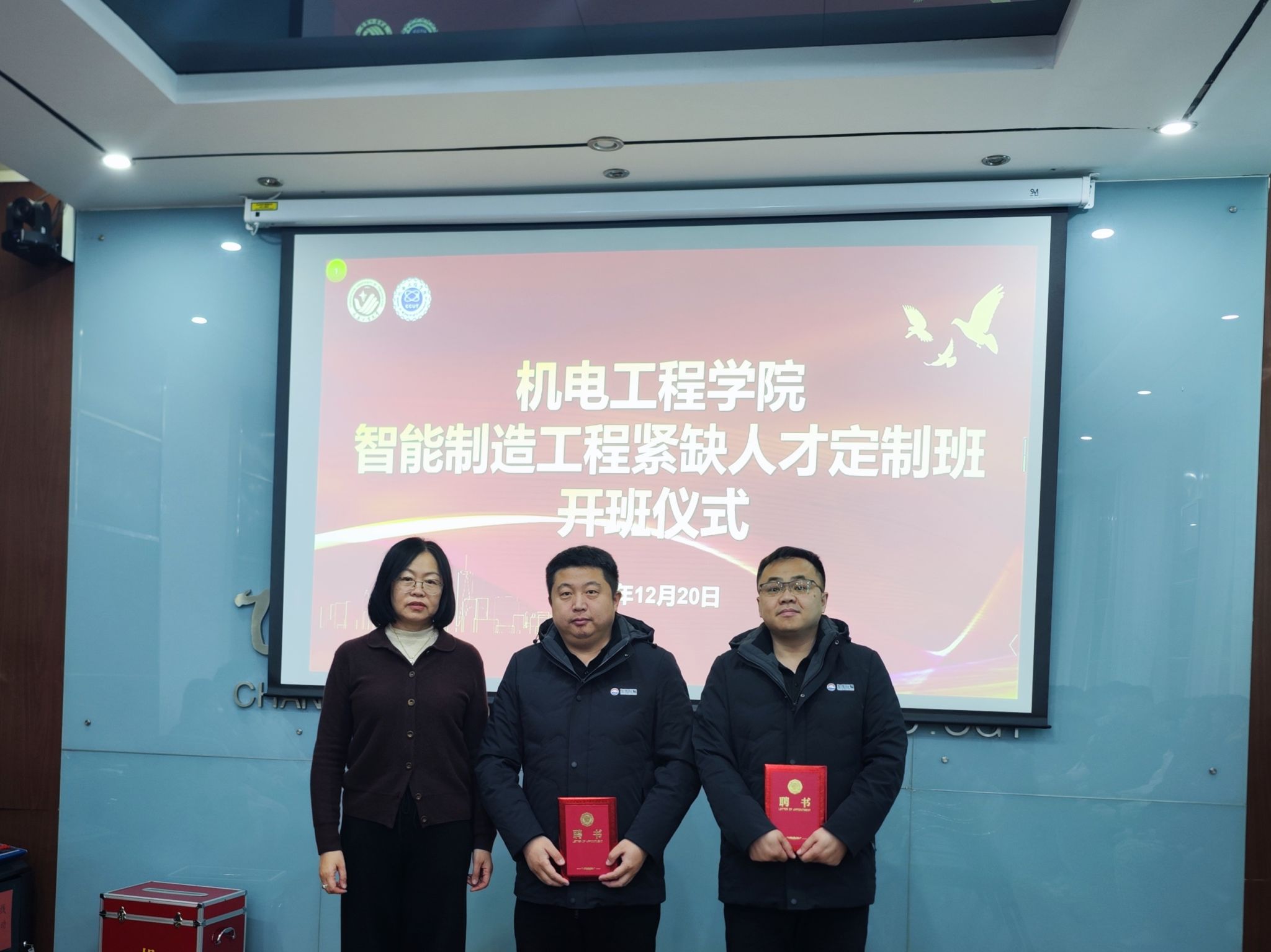 在仪式上,mobile28365正规网址教务处处长冉旭还为长春旭阳汽车座椅有限公司的运营/质量总监马文冲、物流部经理雷洋颁发了mobile28365产业教授聘书,为人力资源部经理马东丹颁发了mobile28365职业生涯规划导师聘书。